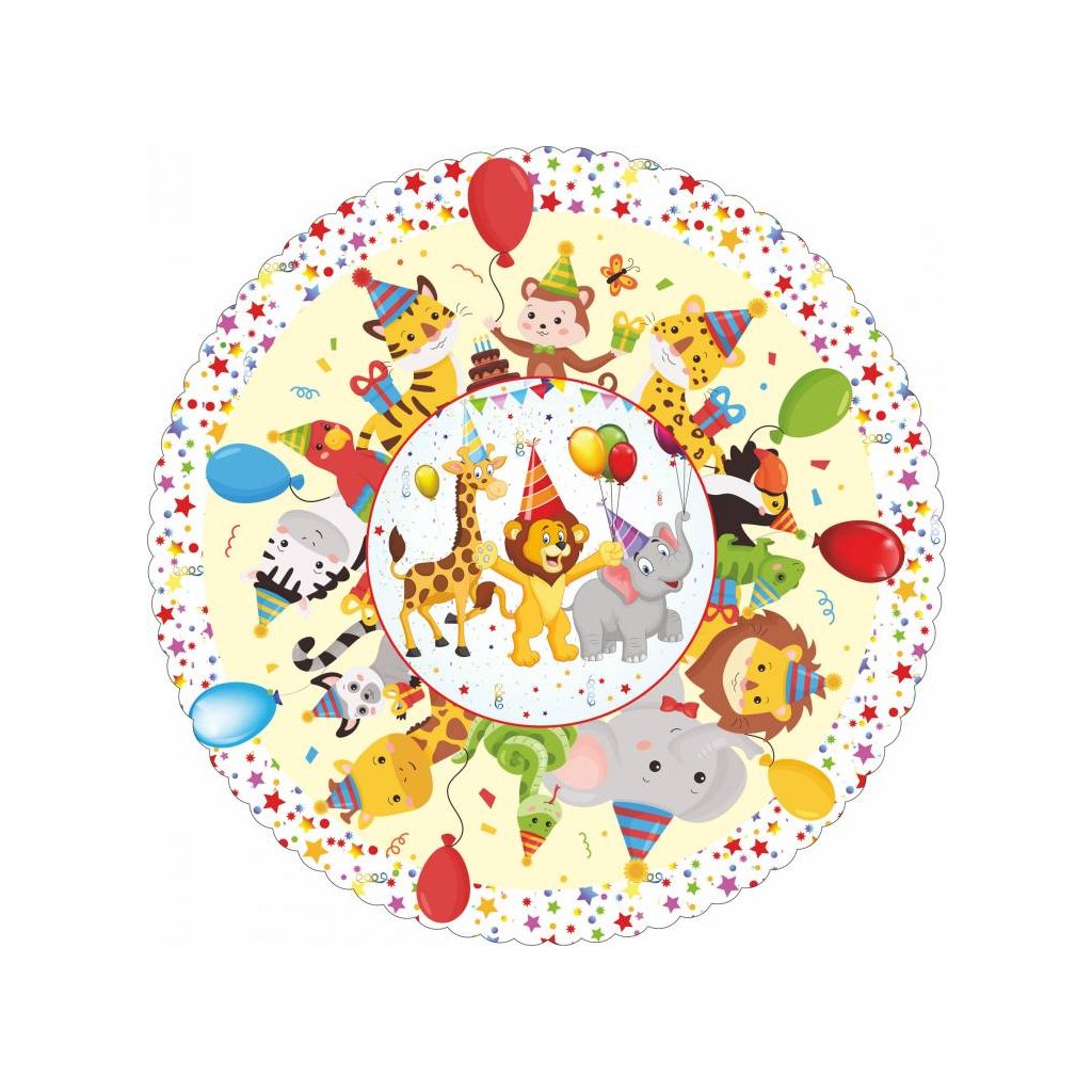Alvarak dortová podložka Narozeninová zvířátka 28 cm + 5x krajková bílá podložka ♡