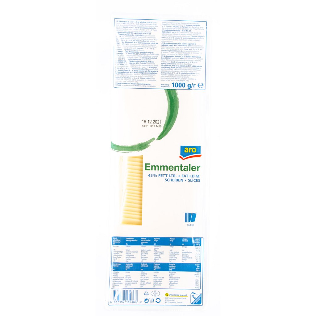 NUTRIČNÍ HODNOTY produktu - aro Emmentaler 45 % plátky 1 kg / 100g výrobku