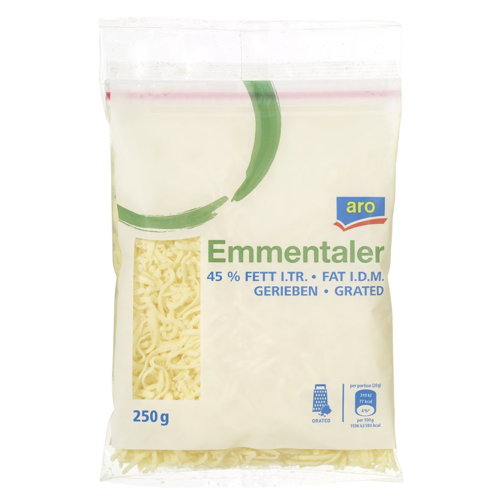 - Emmental strouhaný, sýr, 45 % tuku v sušině. Obsah sušiny min. 60 %. Baleno v ochranné atmosféře.