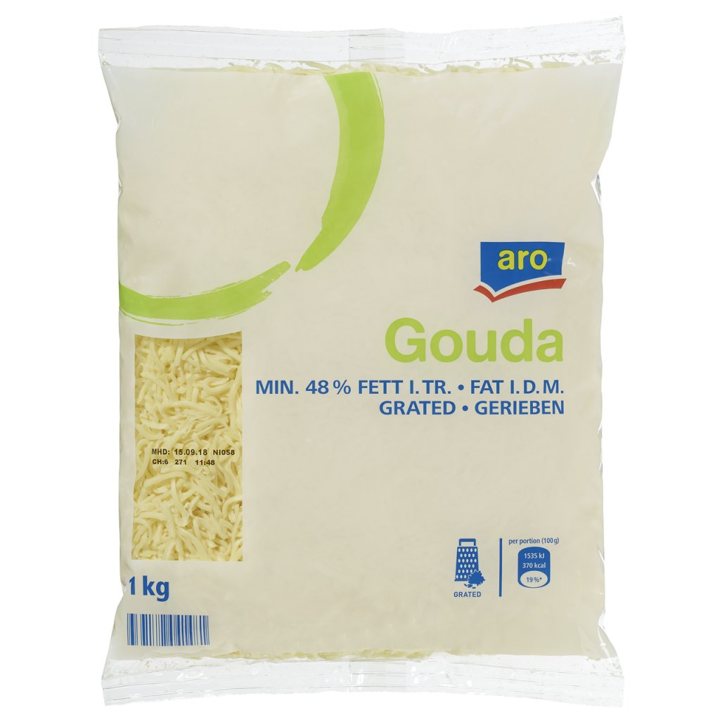 - Gouda strouhaná, sýr. Tuk v sušině 48 %. Obsah sušiny min. 56 %. Baleno v ochranné atmosféře.