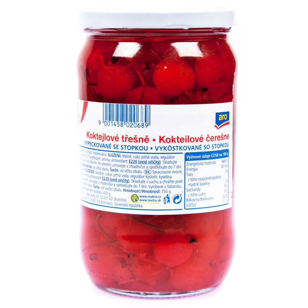 Nakupovat potraviny, drogerii a další potřeby pro domácnost online se vyplatí. Náš online supermarket Terunka.cz, toho má v kategorii: mnohem více. Prohlédněte si celou naší nabídku a ušetřete svůj čas i peníze.aro Koktejlové třešně červené se stopkou 750 g za skvělou cenu, máme skladem.