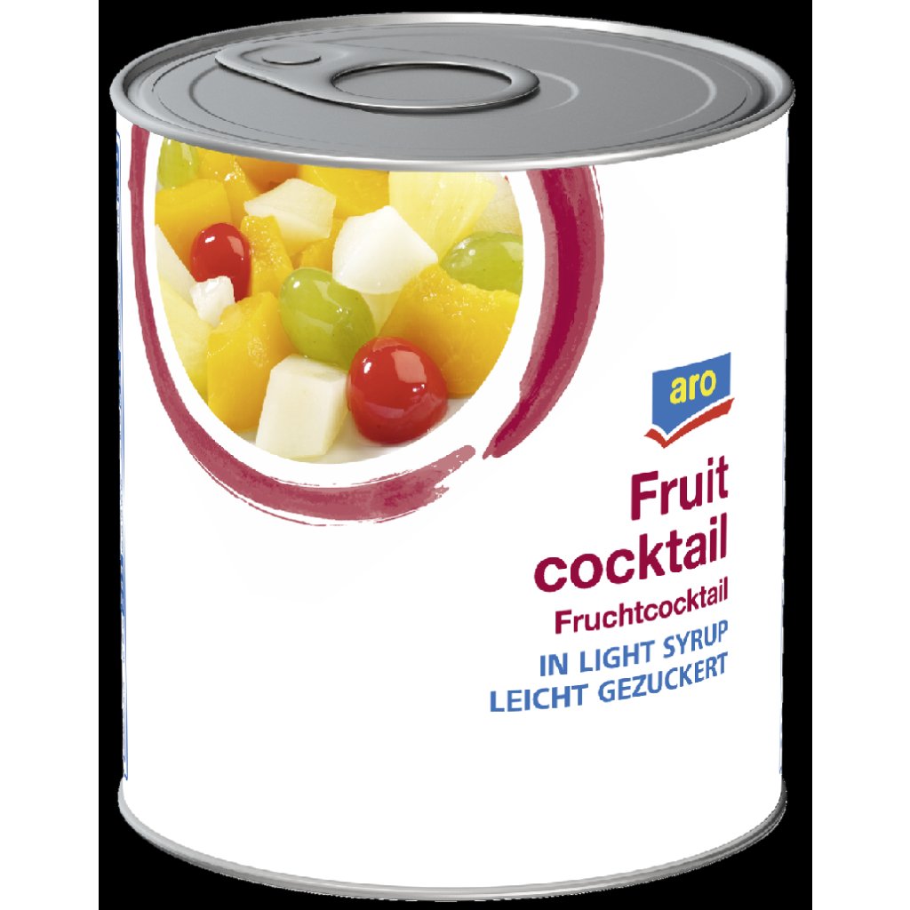 - Směs ovoce v proměnlivém poměru [hruška, broskev, ananas, hroznové víno, třešně (barvivo: erythrosin)], voda, cukr, regulátor kyselosti: kyselina citronová; antioxidant: kyselina askorbová.