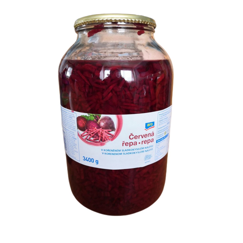 - ARO Červená řepa řezaná. Zpracovaná zelenina jednodruhová, dělená, sterilovaná ve sladkokyselém kořeněném nálevu s cukrem a sladidlem.