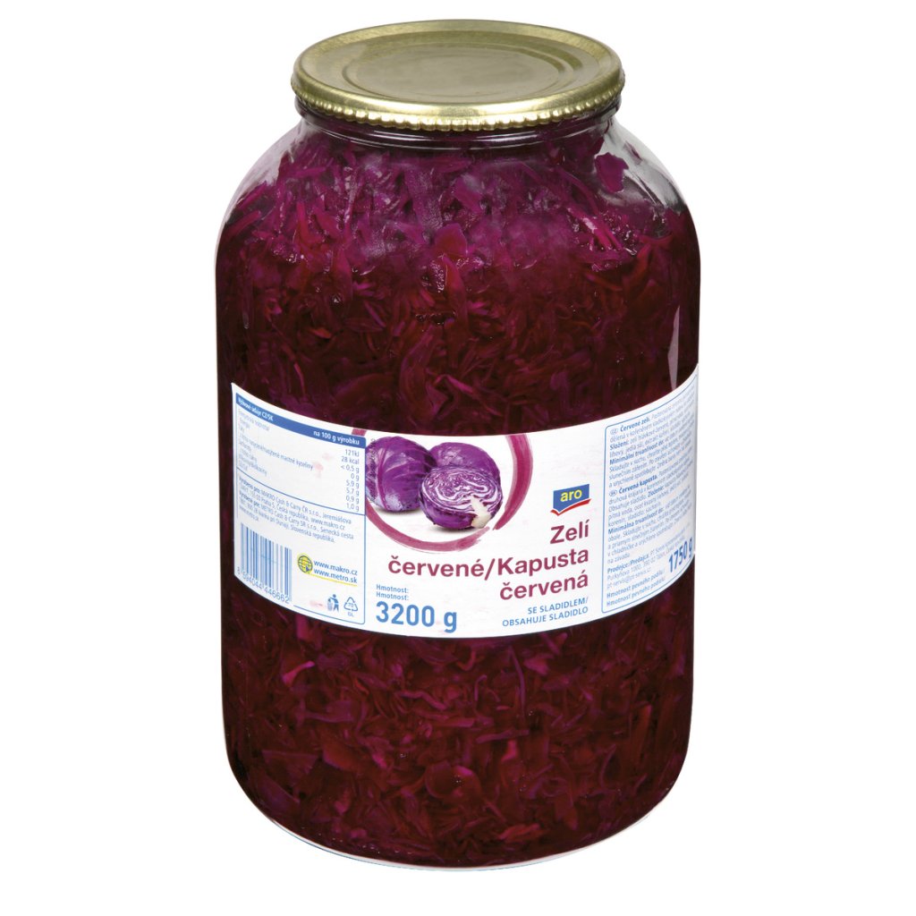 - Zelí červené. Pasterovaná zelenina jednodruhová dělená v kořeněném sladkokyselém nálevu se sladidlem.