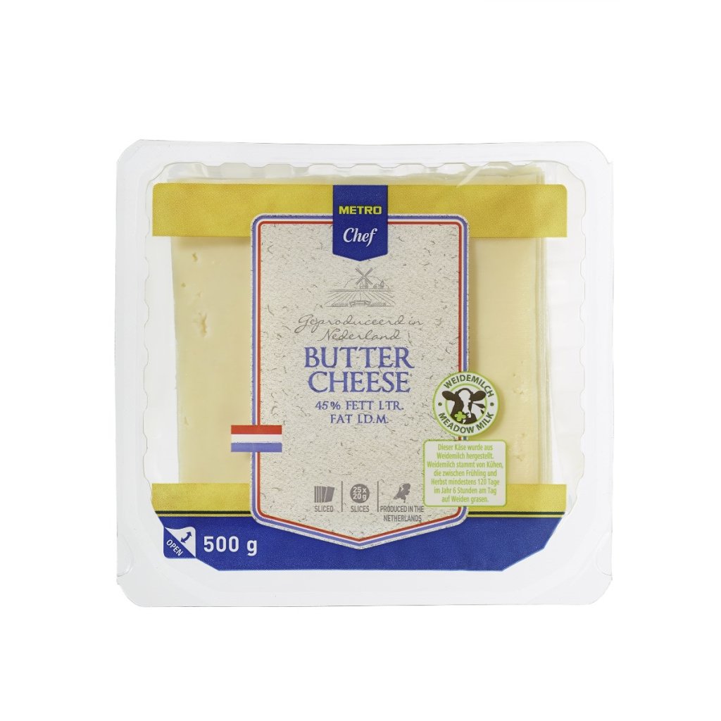 - Buttercheese, 45 % tuku v sušině, sýr plátky.
