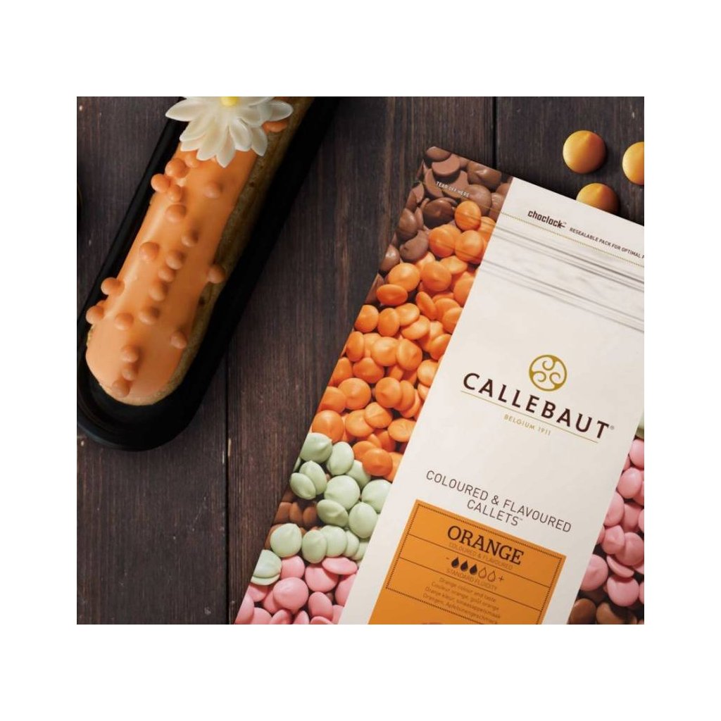 Chuť pomerančů a oranžová barva. Prožijte život v barvách. Přichází vynikající čokoláda pro dokončení vašich výtvorů překvapivou špetkou barvy a příchuti. Orange Callets™, vyrobené z belgické bílé čokolády Callebaut®, kombinuje smetanovou a karamelovou sladkost s hořko-sladkou chutí pomerančů. S jejich standardní tekutostí můžete Orange Callets™ použít pro stejný široký rozsah použití, jako tradiční čokolády Callebaut. Můžete je použít pro přidání barevných detailů odlitkům čokolády a pralinkám nebo vytvářen malé barevné ozdoby. Navíc jsou vynikající pro dochucování krémů a pěn s osvěžujícím šmrncem. Tavení, temperování a chlazení probíhá přesně stejně, jako tradičních bílých čokolád Callebaut.