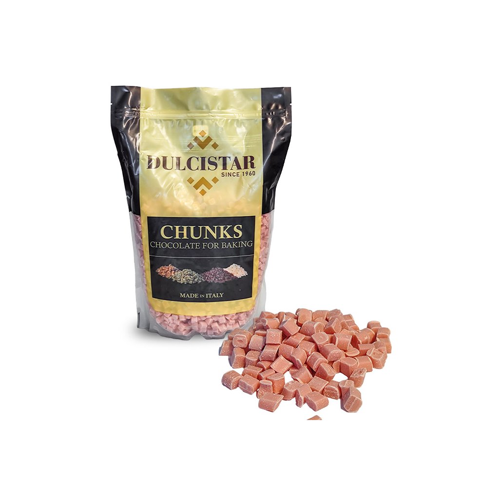 Kostky z čokolády jahodové barvy a chuti, ideální k dekoraci a plnění výrobků před upečením, např. k přípravě muffinů, sušenek a panettone.