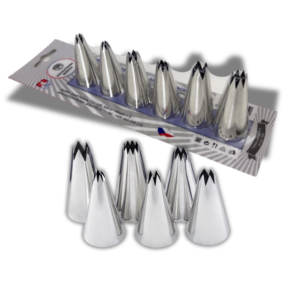 Vyrobeny z pocínovaného zdravotně nezávadného plechu, tyto špičky jsou nejen bezpečné pro styk s potravinami, ale také odolné a snadno se čistí. Díky tomu se můžete soustředit na zdobení, aniž byste se museli obávat o zdraví svých blízkých.