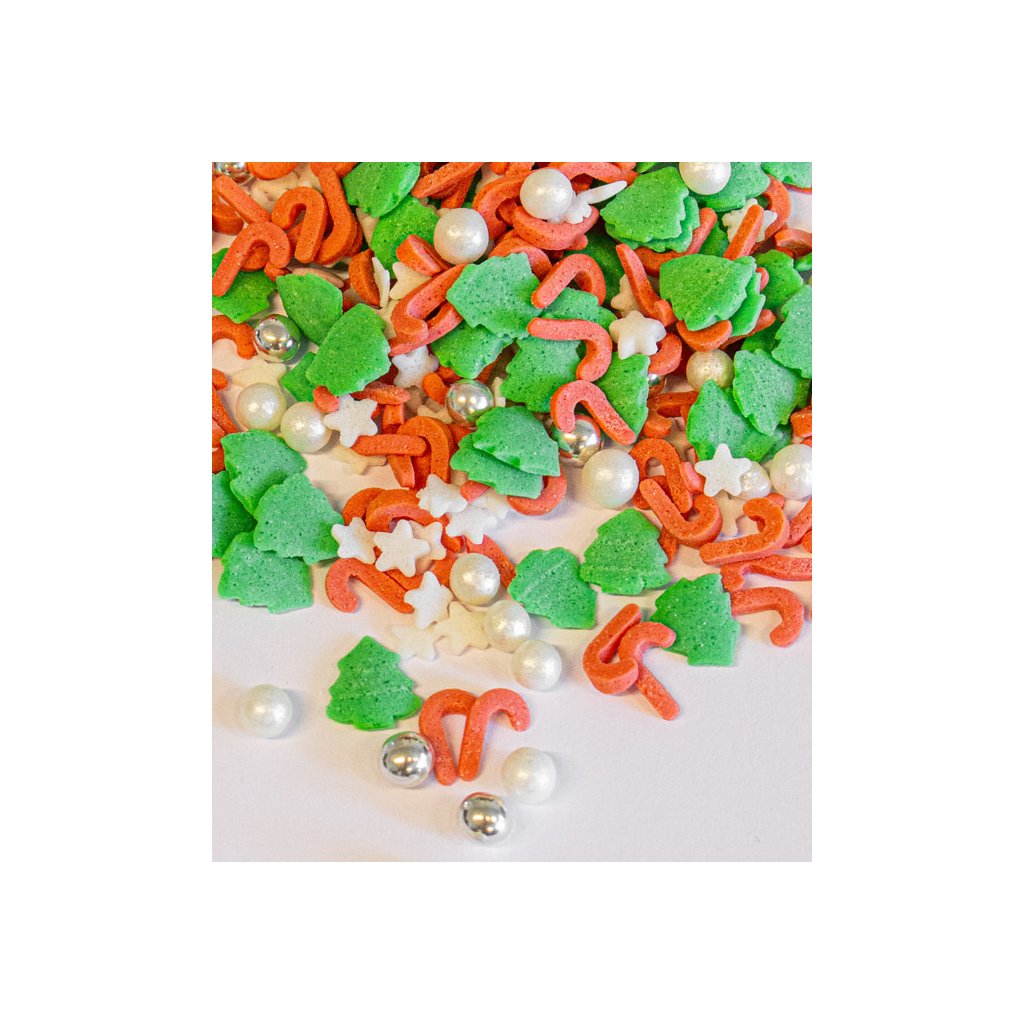 Cukrový Vánoční mix stromečků, kuliček a hvězdiček v barvách zelené, červené a bílé.