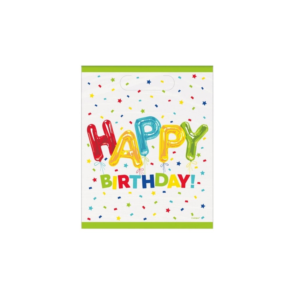 Tyto plastové dárkové taštičky s motivem „Happy Birthday“ a balónky jsou perfektním doplňkem každé narozeninové oslavy. V balení najdete 8 kusů, které můžete naplnit sladkostmi, drobnými hračkami nebo překvapením pro malé hosty. Barevný a veselý design s balónky a konfetami skvěle ladí s ostatními produkty ze stejné kolekce. Praktické tašky s ouškem jsou lehké, ale dostatečně pevné pro běžné použití. Ideální jako výslužka pro děti na závěr party. Materiál: PlastRozměry: 22 x 18 cmBalení: 8 ks| Kategorie: | Nafukovací barevné balónky |