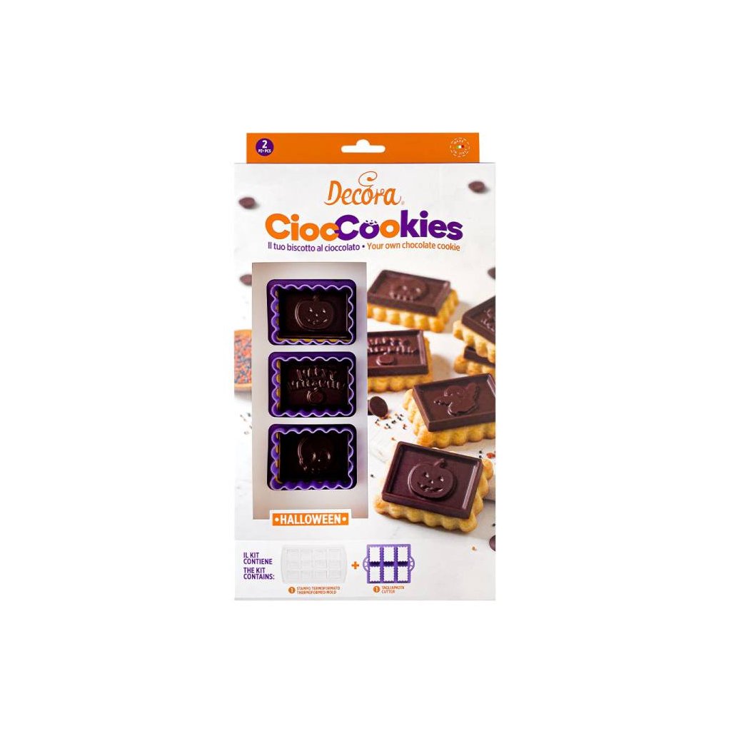 Dvoudílná sada ideální pro snadnou a rychlou výrobu sušenek s čokoládou s halloweenským motivem.