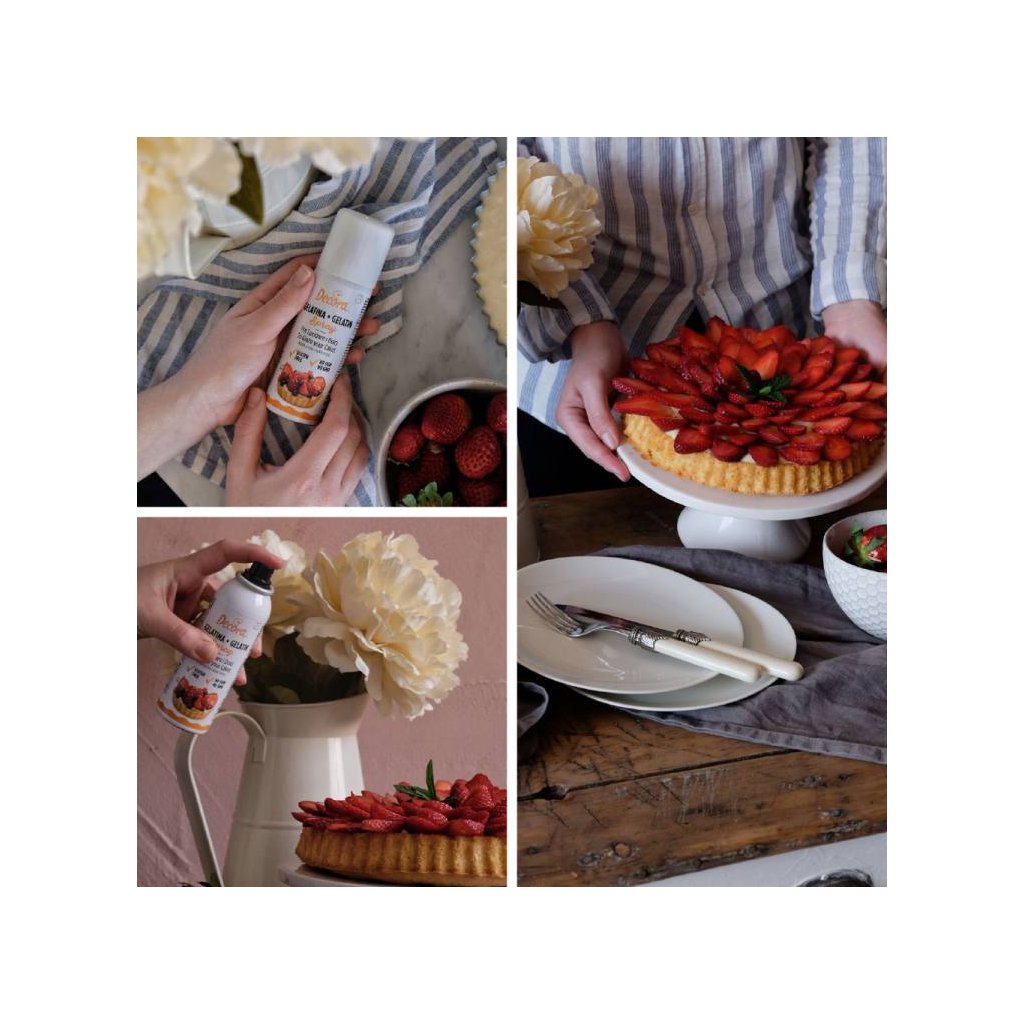 Tento sprej umožňuje pokrýt cukrářský produkt stejnoměrnou a tenkou vrstvou želatiny. Složení: voda, glukózový sirup, zahušťovadlo agar-agar, regulátor kyselosti kyselina citronová, konzervant sorban draselný Nutriční hodnoty ve 100 g: energie 743 kJ/175 kcal, tuky 0 g (z toho nasycené 0 g), sacharidy 43,5 g (z toho cukry 19 g), vláknina 0,4 g, bílkoviny 0 g, sůl 0 gDoplňkové parametry