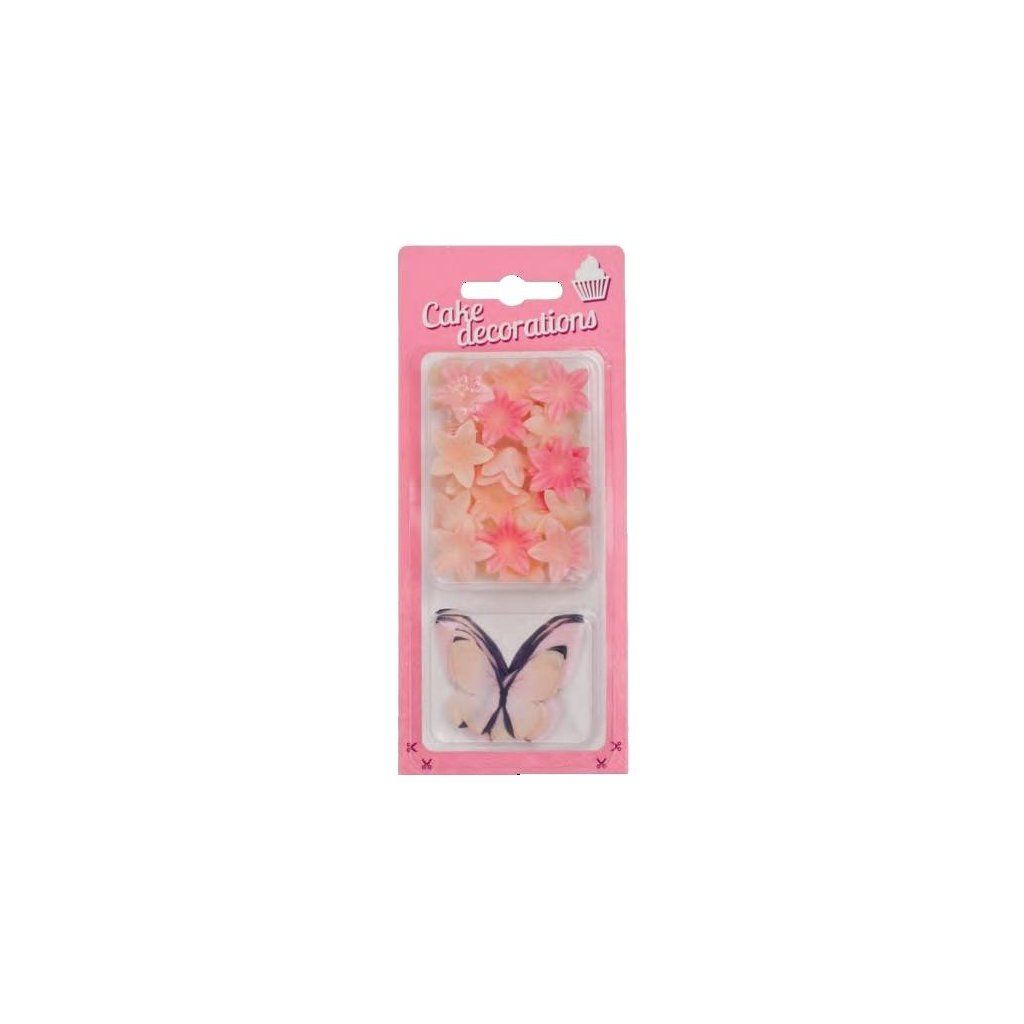 Dekorace z jedlého papíru Motýlci lososoví a květiny mini lososové (30 ks) ▹