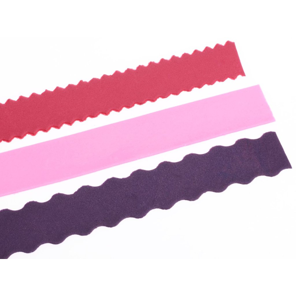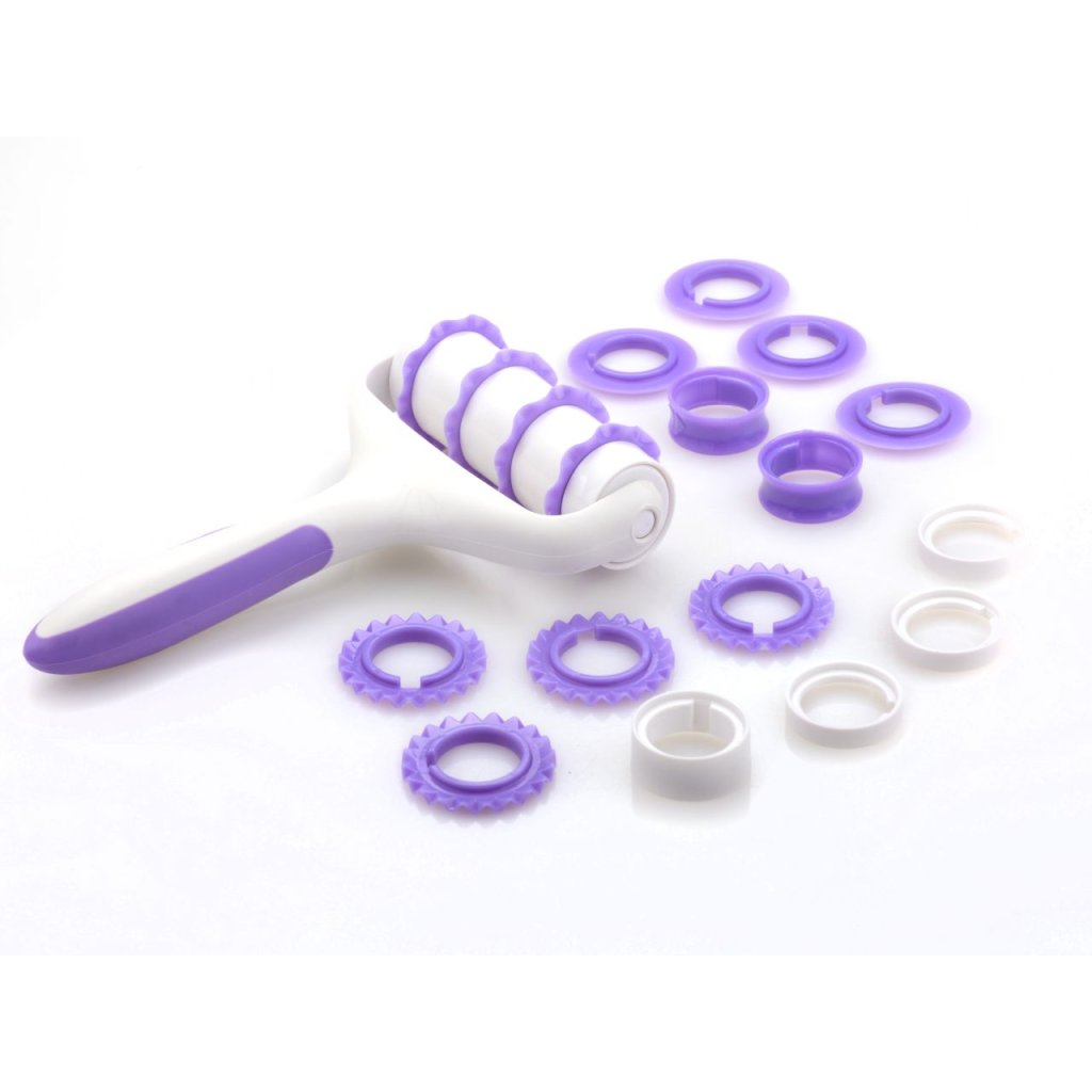 Naše rádýlko oceníte především při potahování dortu a to v okamžiku kdy potřebujete na dekoraci dortu použít fondánové nbo marcipánové proužky. Toto rádélko má vyměnitelné čepele a lze řezat hladké a ozdobné pásky. Určeno tedy k výrobě ozdobných stuh z fondánu nebo marcipánu. V jednom pracovním procesu můžete vyrobit několik stuh najednou. Mnoho tvarů i šířek. Sada obsahuje 25 různých dílků.