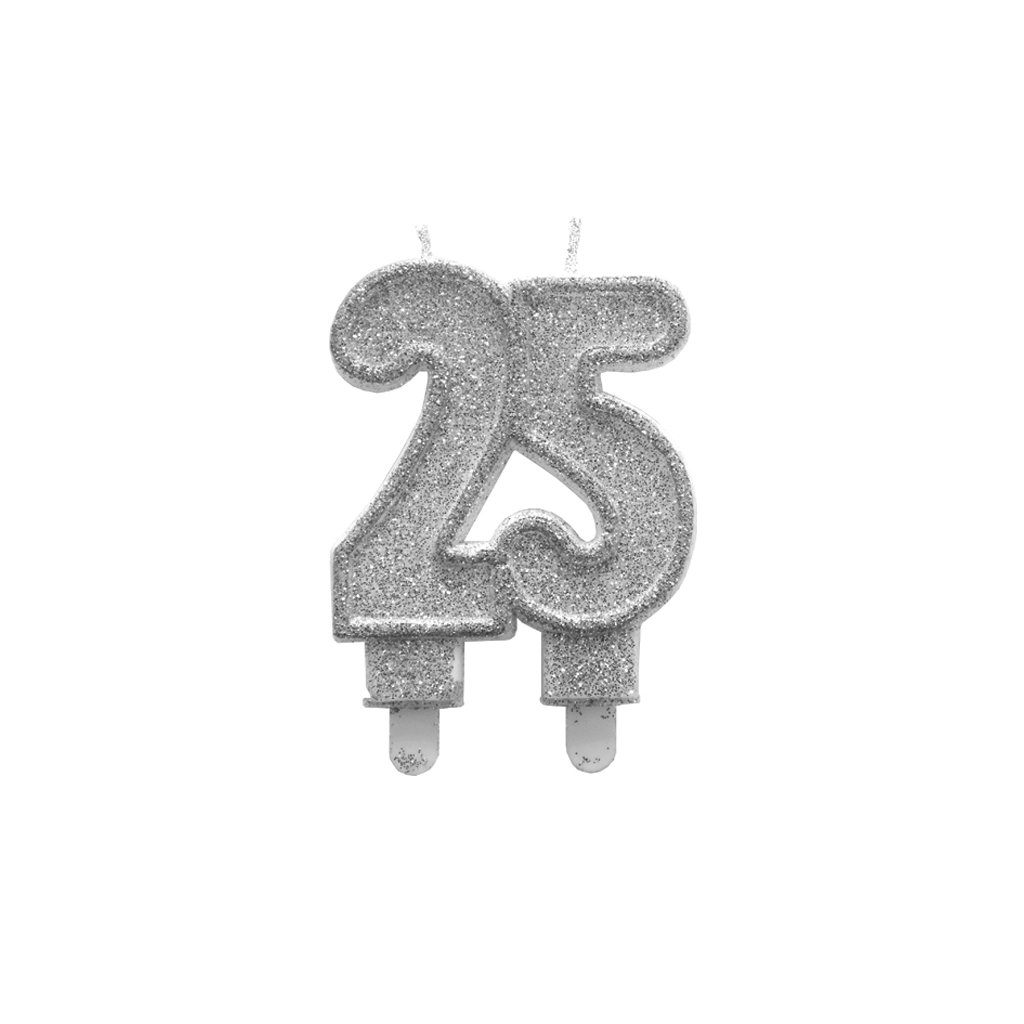 Slavnostní dortová svíčka se stříbrným leskem ve tvaru číslovky číslo 25