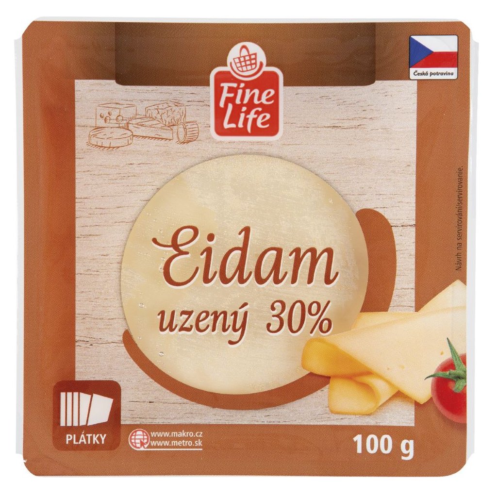 - FL PLÁTKY EIDAM UZENÝ 30% 100g přírodní zrající polotučnýpolotvrdý sýr, uzený, plátky.