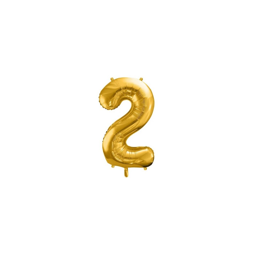 Foliová číslice 2 ve zlaté barvě. Balonek je vhodný na narozeninové oslavy kde může vyobrazovat věk oslavence nebo výročí firmy a další.