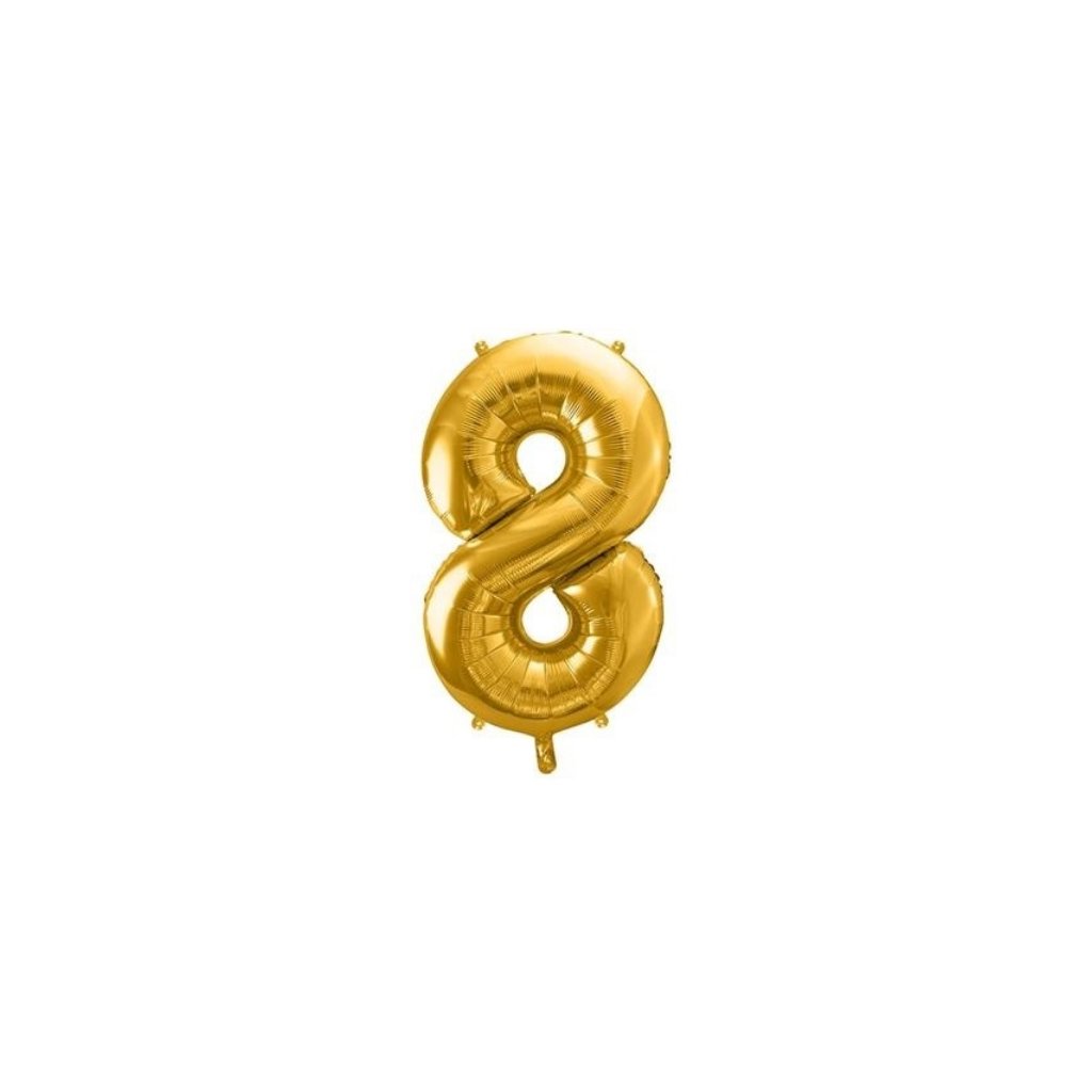Foliová číslice 8 ve zlaté barvě. Balonek je vhodný na narozeninové oslavy kde může vyobrazovat věk oslavence nebo výročí firmy a další.