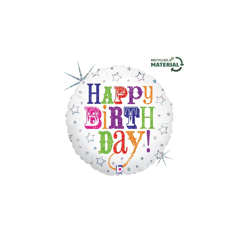 Jemný a zároveň výrazný – takový je tento kulatý fóliový balonek s barevným nápisem HAPPY BIRTHDAY, který září na bílém pozadí spolu s holografickými hvězdami. Skvěle se hodí k oslavám pro děti i dospělé, k moderním i veselým barevným aranžím. Balonek je vyrobený z holografické fólie a díky své třpytivé úpravě krásně odráží světlo. Kombinace více druhů písma působí hravě a stylově. Výborně vynikne v kombinaci s dalšími balonky, ale neztratí se ani samostatně. Navíc potěší i ekologicky – vyroben z recyklovaného materiálu.Balonek má samo uzávěr, což zajišťuje pohodlné a bezpečné použití. Rozměry: 35 x 35 cmMateriál: Holografická fólie (recyklovaná)Barva: Bílá s barevným potiskemBalení: 1 ksNafukování: HéliumObjem: 15 lUzávěr: Samo uzávěr| Kategorie: | Nafukovací barevné balónky |