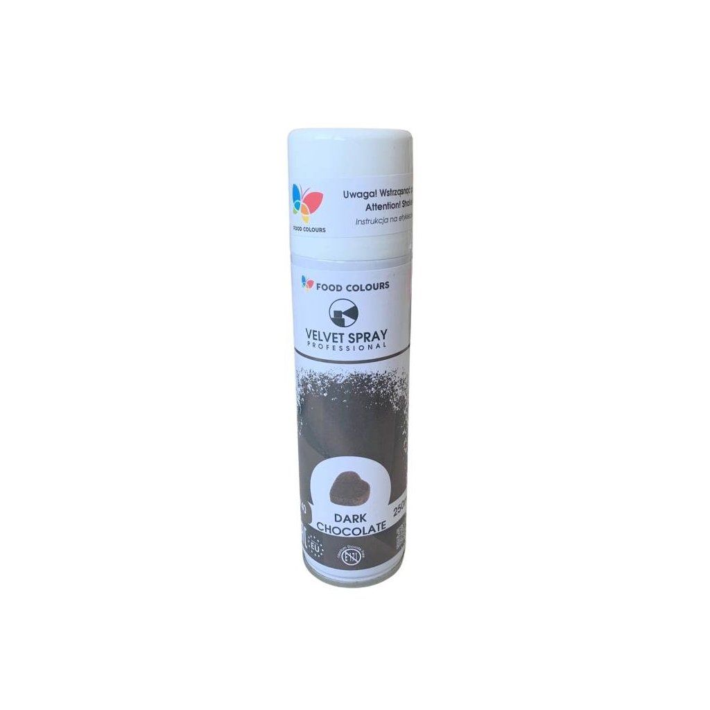 Sametová barva ve spreji ke zdobení vychlazených povrchů, např. máslových krémů, fondánových hmot, marcipánu, zákusků, čokolády a dalších.