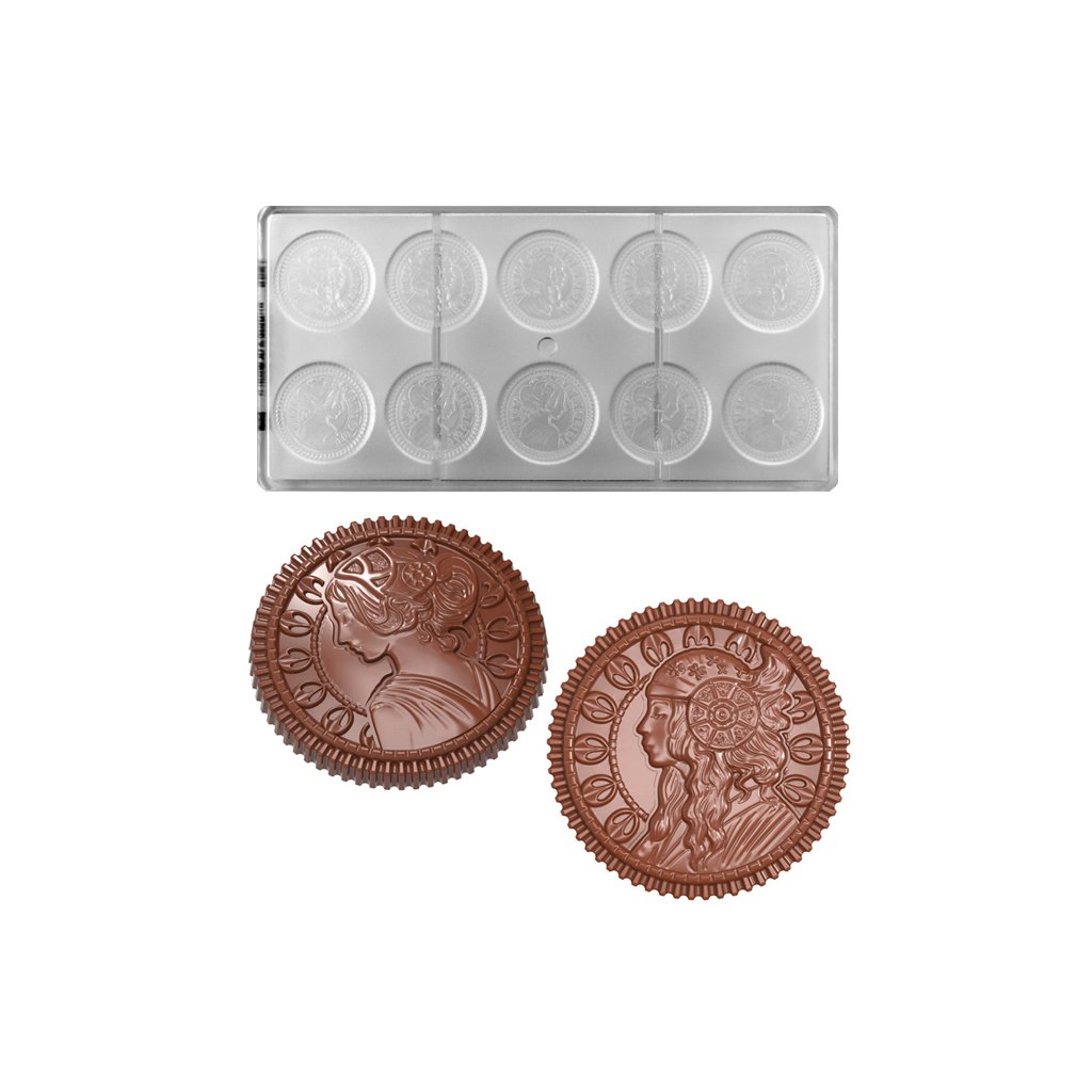 Cukrářská pevná polykarbonátová forma na výrobu čokoládových mincí. Forma obsahuje 5 tvarů lícu a 5 tvarů rubu mince.