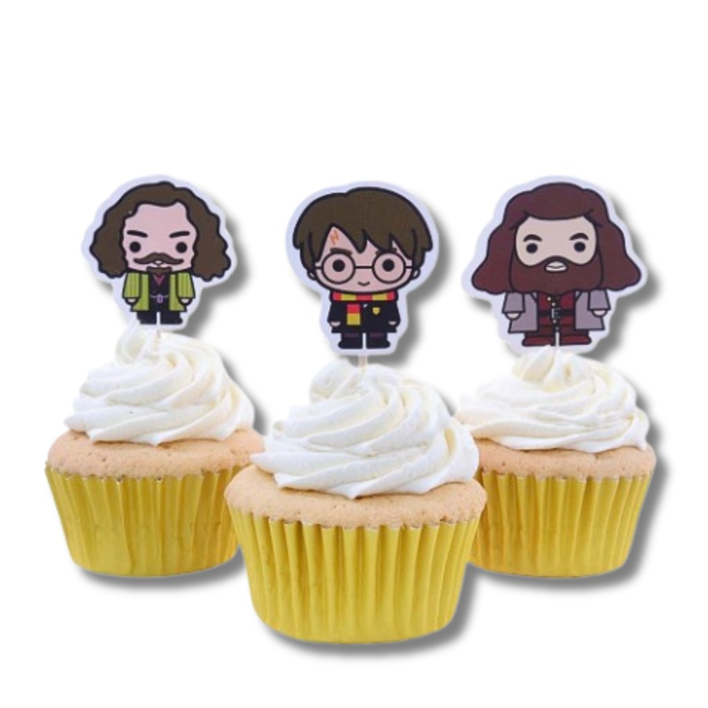 15 ks oboustranných papírových zápiuchů na dřevěných tyčkách, postavy Nebelvír, Zmijozel, Havraspár, Mrzimor a Bradavice. Zápichy měří přibližně 45 x 55 mm.