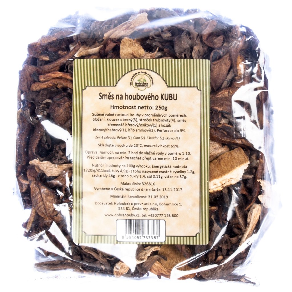 - Směs sušených hub v různém poměru: Klouzek obecný, Stroček trubkovitý, Hřib smrkový, Kozák březový/habrový, Křemenáč březový/osikový