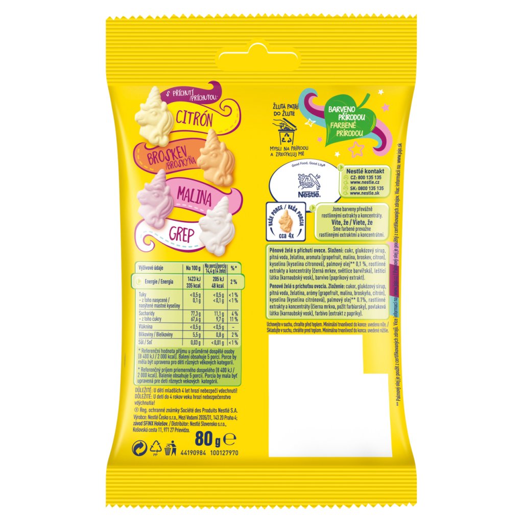 NUTRIČNÍ HODNOTY produktu - Jojo Jednorožci pěnové želé bonbóny 80 g / 100g výrobku