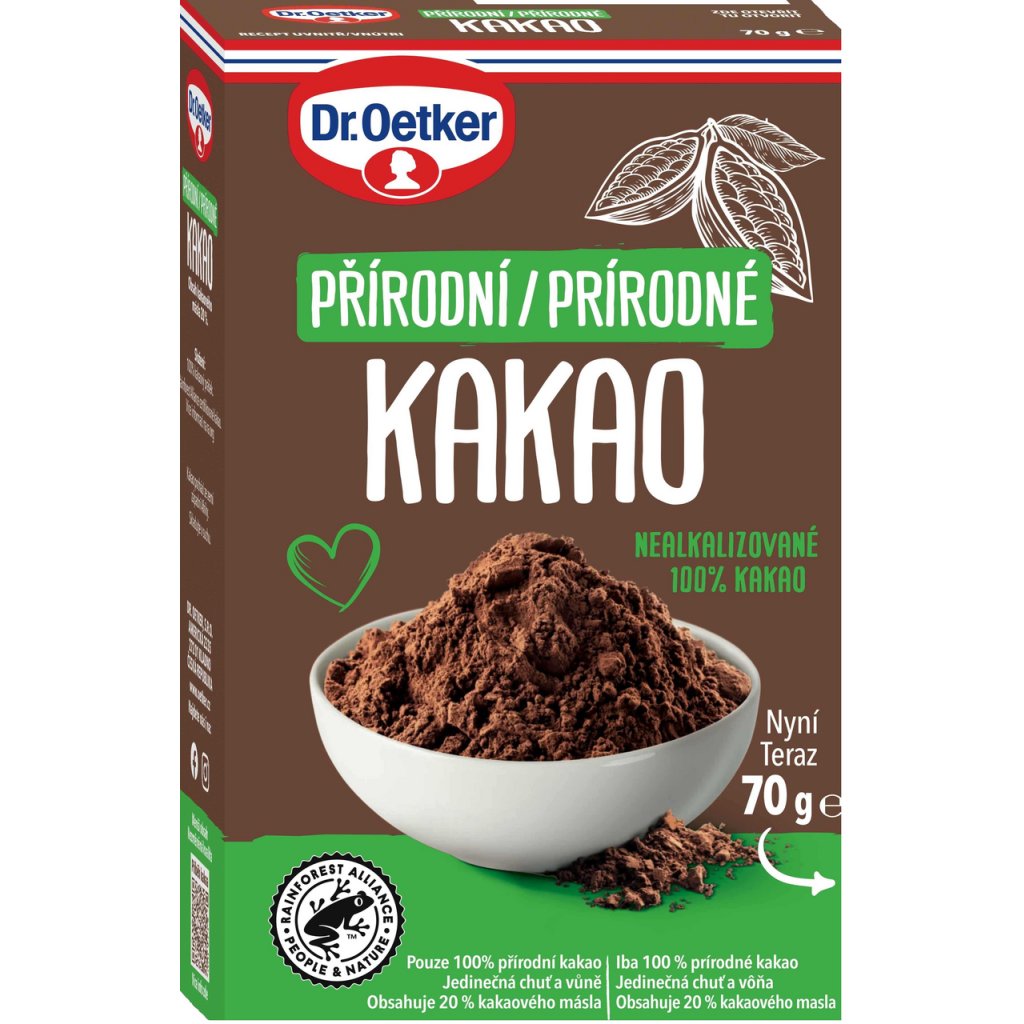 - Přírodní kakao Dr. Oetker je 100 % kakao s jedinečnou přirozenou plnou kakaovou chutí a vůní. Zachovává si důležité vlastnosti kakaových bobů, neboť neprošlo alkalizačním procesem. Je proto bohaté zejména na velmi ceněné antioxidanty. Přírodní kakao má světlejší barvu než kakao holandské a nižší pH. Díky této vlastnosti je velmi žádané např. do receptů na pečení s použitím jedlé sody. Přírodní kakao je nejoblíbenější v Severní Americe. Dopřejte si jedinečné 100 % Přírodní kakao Dr. Oetker všude tam, kde vám záleží na výsledné chuti a kvalitě.