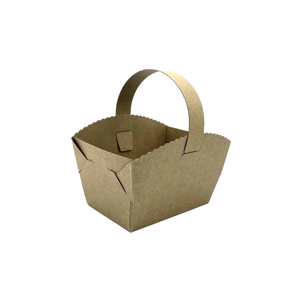 Košíček na svatební výslužku vyrobený z hnědého kartonu, vhodný například na koláčky, drobné chuťovky či svatební pečivo. Hodí se na všechny příležitosti, jako jsou svatby, firemní večírky nebo oslavy narozenin. Odnosový košíček je vyroben z FSC® certifikovaného materiálu a dle mezinárodních norem BRC(G)S standardů pro bezpečnost potravin. Pro své snadné skládání jsou dodávany v rozloženém stavu. Materiál je vhodný pro přímý styk s mastnou a vlhkou potravinou. Balení 50 ks Velikost 9 x 6 x 7 cm + ouško.Doplňkové parametry