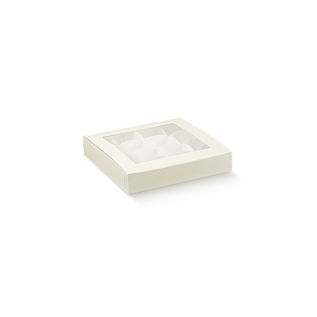 Papírová krabice z pevného kartonu v barvě bílé kůže, s plastovým průhledem ve víku a rozdělovačem na 24 políček.