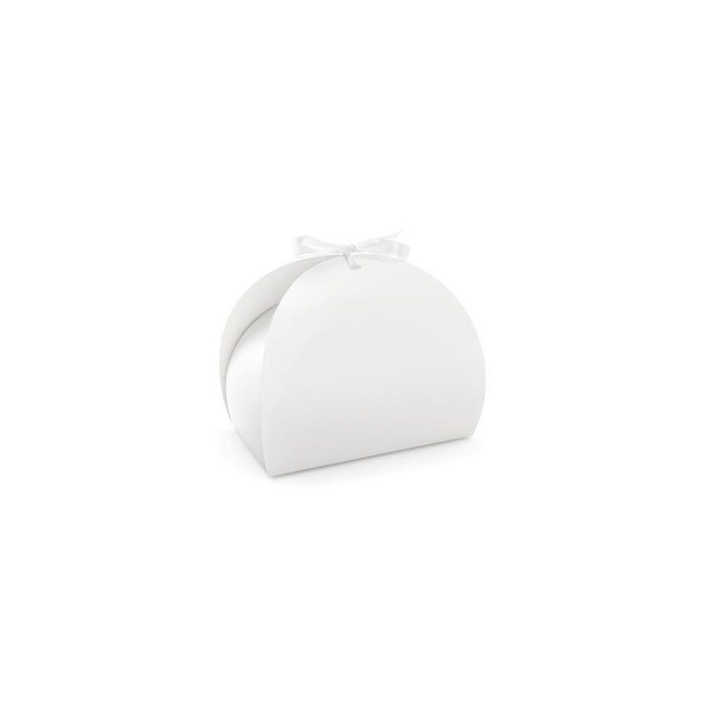 Bílá papírová krabička na výslužku se zaoblenými tvary a mašlí, která na svatbě nesmí chybět. Každý host si tak ze svatby odnese svou část.