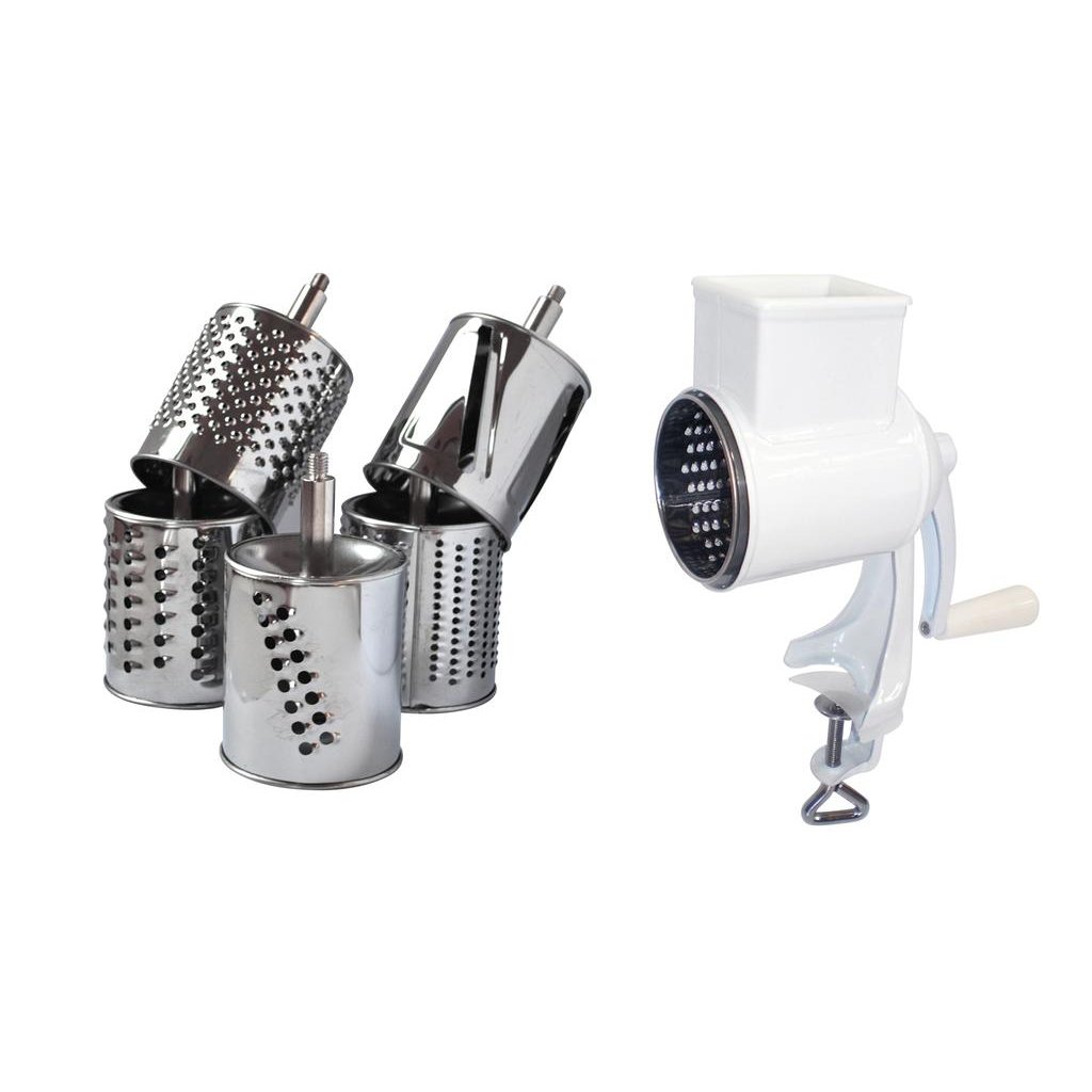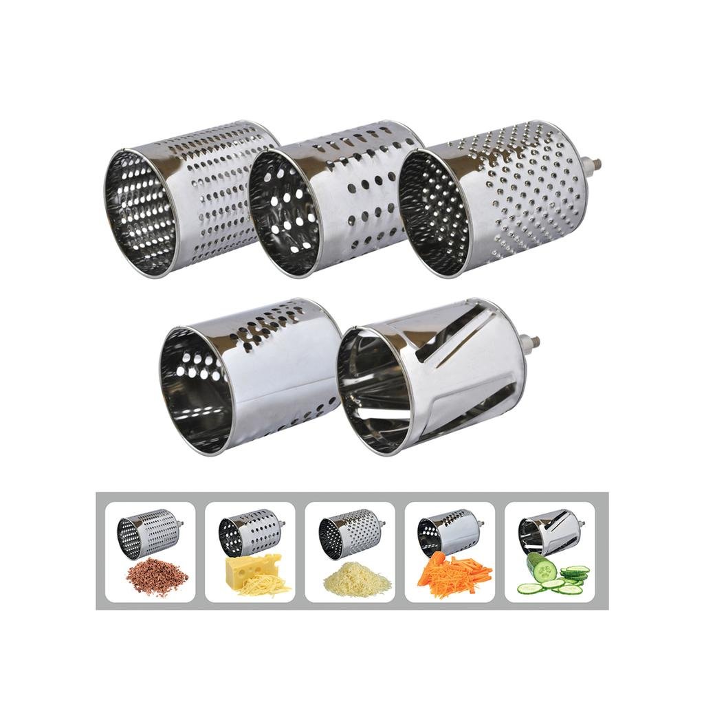 Mlýnek pro snadné a rychlé mletí sýrů a ořechů, vyroben z kovu a nerezavějící oceli, snadné použití a údržba, 5 ks výměnných nástavců - na strouhanku, sýr, zeleninu či ovoce na plátky apod., vhodné do myčky na nádobí. Uchycení ke stolu na šroub. Násypka s přítlačným nástavcem pro bezpečné mletí.