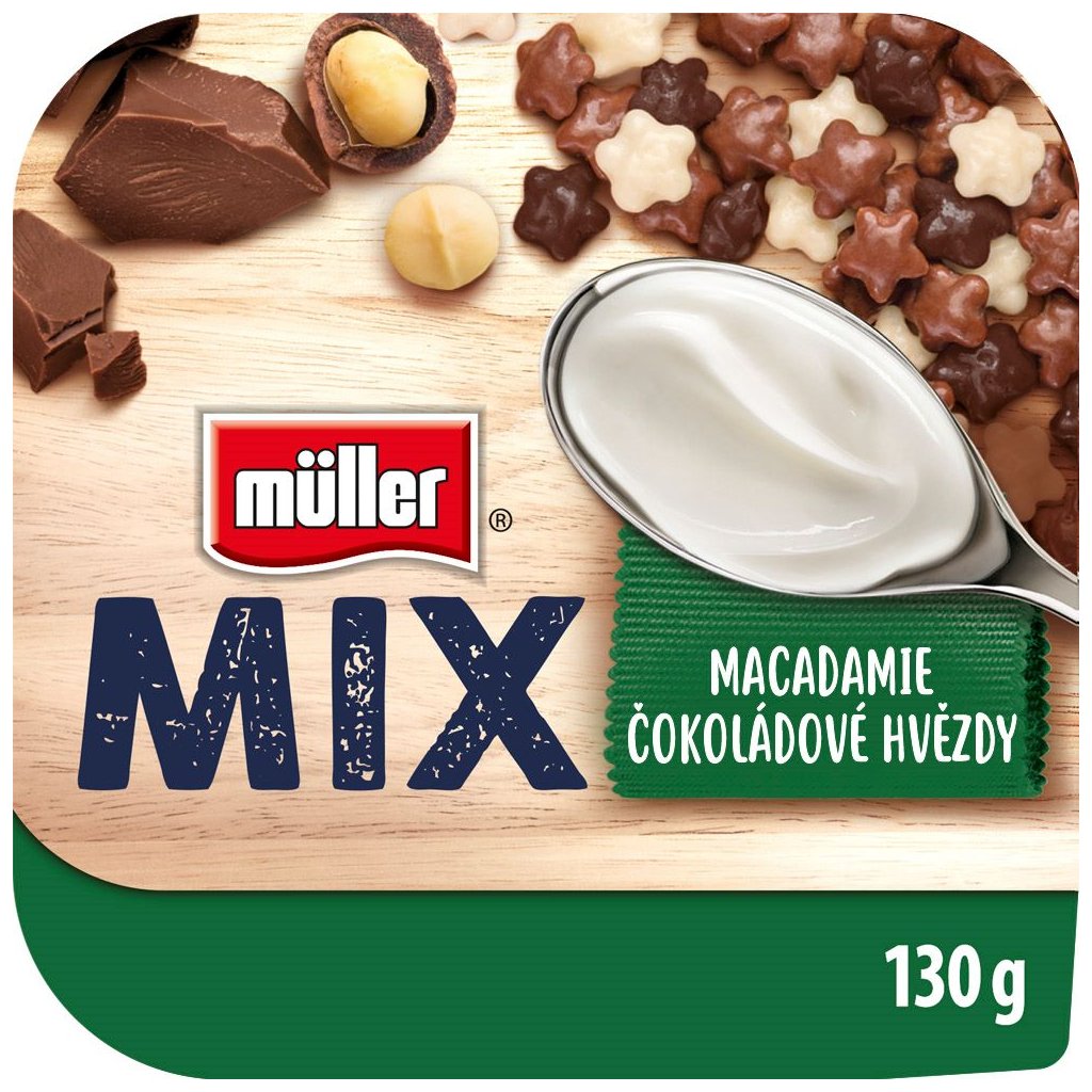 - Jogurt s příchutí makadamových ořechů a s 8,4 % čokoládových hvězdiček (s 20 % čokolády, 20 % bílé čokolády a 20 % mléčné čokolády).