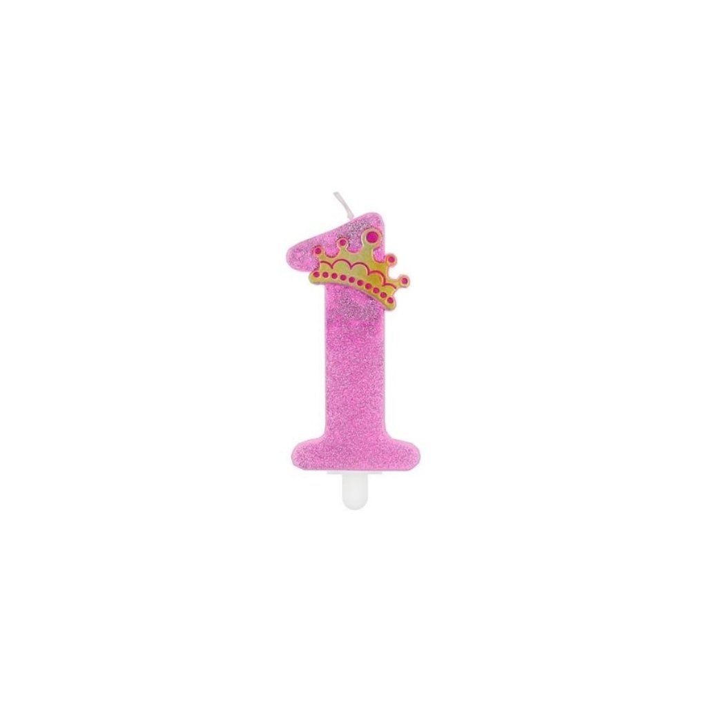 Narozeninová svíčka 1 ve třpytivé růžové barvě a korunkou. Velikost: 9 cm. Balení: 1 ks.Doplňkové parametry