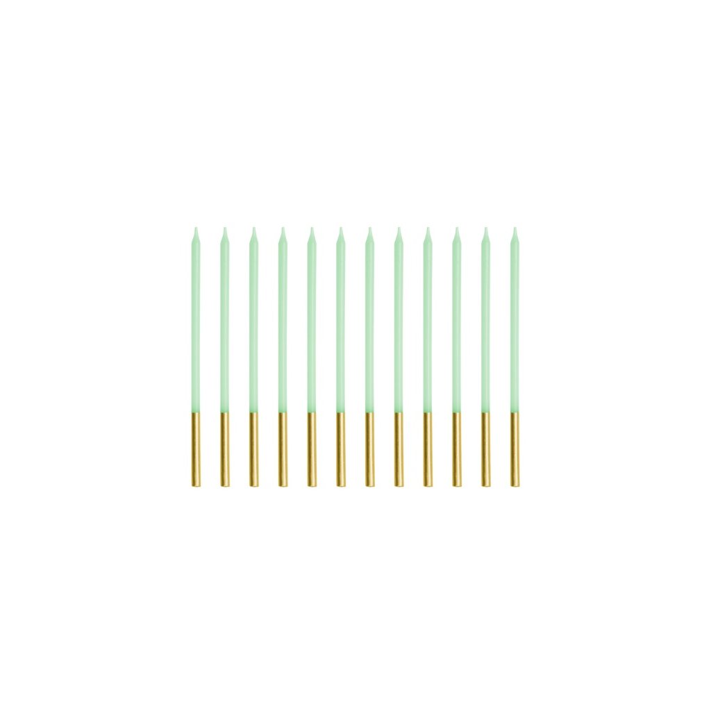 Dlouhé dortové svíčky v světle zelené barvě se zlatou základnou. Ozdobí narozeninový dort jakékoliv velikosti, případně i narozeninový Cupcake. Délka svíček je 14 cm a balení obsahuje celkem 12 kusů. Rozměr: 14 cm Balení: 12 k Obchodní balení: AnoDoplňkové parametry