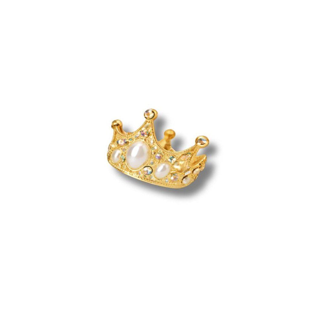 Nejedlá dekorace kovová Koruna zlatá s holografickými kamínky a bílými perlami ▹