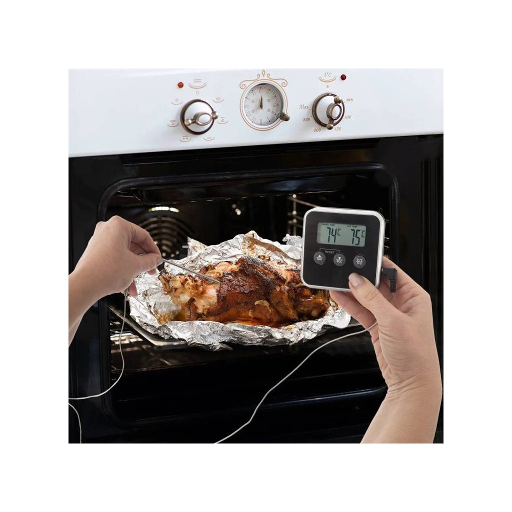 Kuchyňský digitální teploměr se sondou a kuchyňská minutka v jednom je skvělý pomocník nejen při přípravě masa. Využít jej můžete při grilování, pečení masa v troubě, při uzení v udírně, chlazení potravin v lednici, při vaření džemů, sirupů, karamelu apod. Vlastní tělo teploměru z ABS plastu je doplněno kovovým lankem o délce 93 cm, na jehož konci je 16 cm jehla s hrotem z nerezu s/s 304. Tento senzor měří teplotu hluboko uvnitř. Ať už pečete velký kusa hovězího masa, např. nízký roštěnec, vepřovou pečeni, roastbeef nebo jehněčí. teploměr umožňuje nastavit teplotní alarm při dosažení požadované teploty, jakmile teplota pokrmu dosáhne zvolené teploty, ozve se zvukový signál můžete zvolit režim minutky, které klasicky odpočítá nastavený čas a o jeho konci vás informuje zvukový signál možnost nastavení jednotky teploty v °C nebo v °F rozsah měření teploty od -20 °C do +300 °C rozsah časovače 99 min 59 sec Možnost zavěšení, postavení pomocí stojánku nebo přichycení magnetem na zadní straně teploměru. To využijete v momentě, kdy nepotřebujete jednorázově kontrolovat aktuální teplotu, ale teploměr umístíte na přední, kovovou plochu trouby. Lanko se senzorem zapíchnete do masa a necháte jej uvnitř troubyza zavřenými dvířky. Klidně po celou dobu pečení. Návod je součástí výrobku. Přepínač časovače a měření teploty najdete na zadní straně teploměru (COOK/TIMER). Napájení 1x 1,5V AAA baterie (není součástí). Rozměr: 8 x 8 cm| Kategorie: | Cukrářské potřeby |