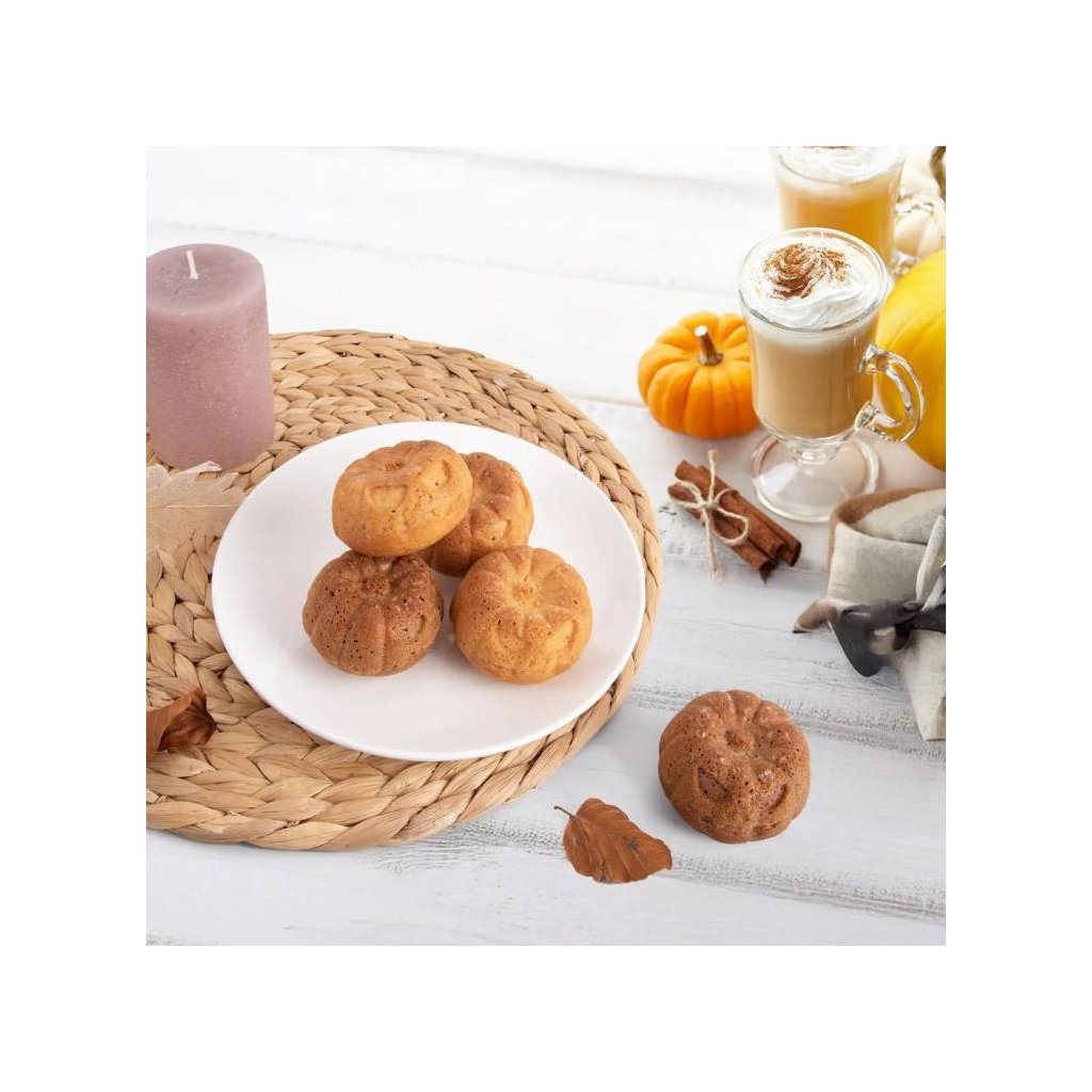 Čas na pečení voňavých, podzimně laděných dobrot, ocení každý. Na nich si pochutnáte v sychravých dnech u dobré kávy. A pokud přijdou halloweenští koledníci, můžete jim tuhle sladkou pozornost nabídnout. Propracované detaily, pružnost a nepřilnavost zajistí šikovná forma. Sladký moučník z litého, třeného nebo klasického piškotového těsta můžete ponechat tak, jak je, nebo je máčet v čokoládové polevě, sypat oříšky nebo barevným posypem. Rozměry: 27 x 18 x 5 cm Průměr jedné dýně: 7 cmDoplňkové parametry