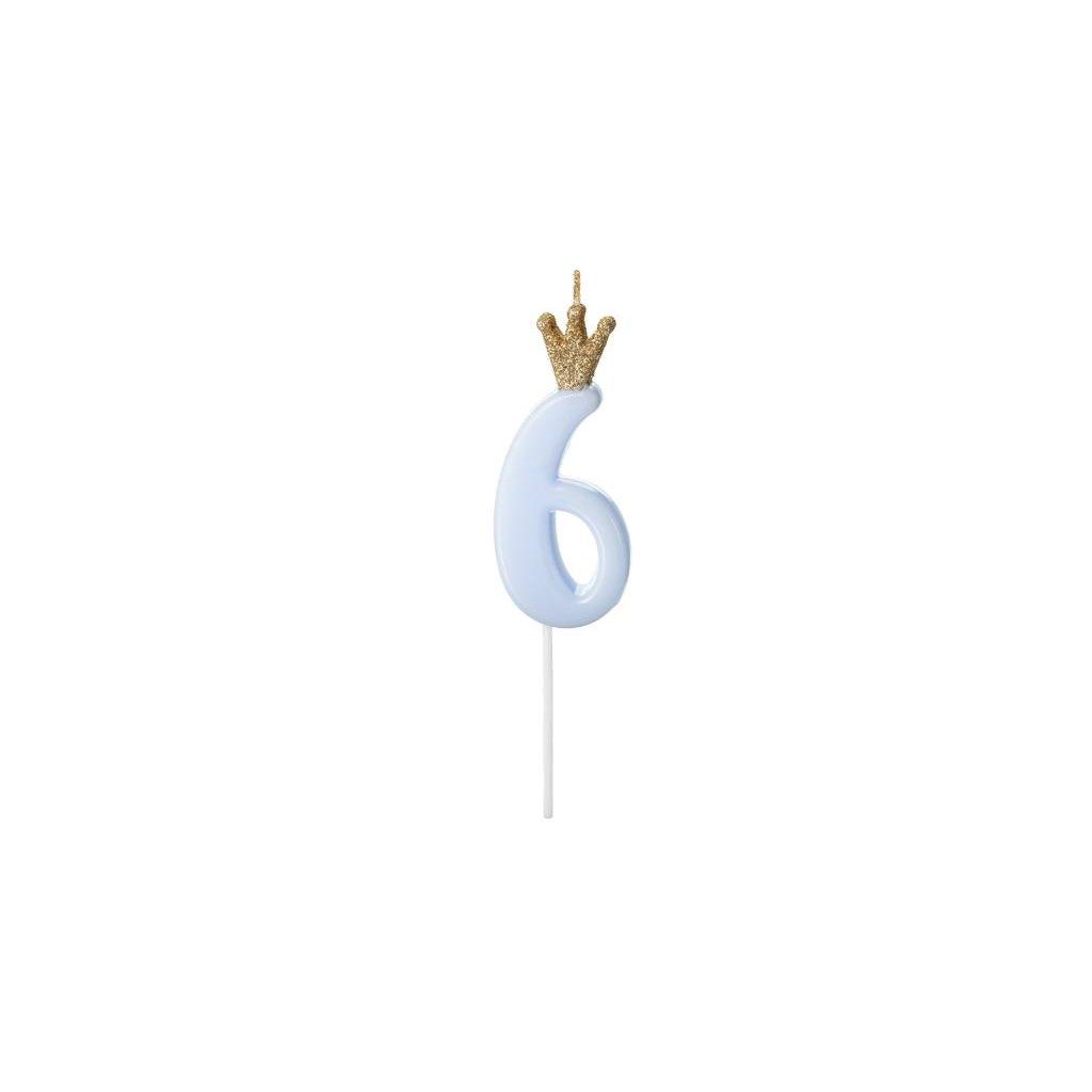 PartyDeco svíčka malá modrá s korunkou číslo 6 ▹