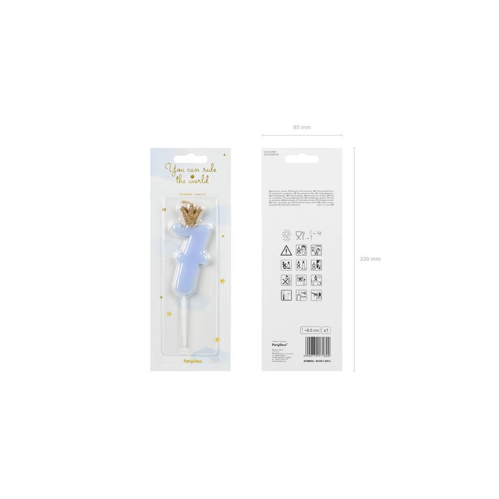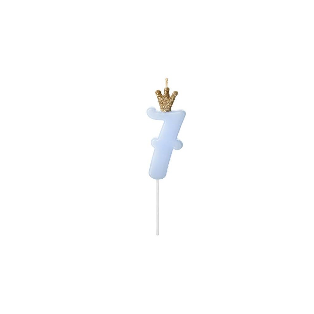 PartyDeco svíčka malá modrá s korunkou číslo 7 ▹