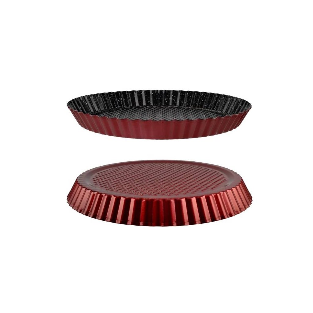 Kvalitní forma na koláč z uhlíkové oceli s nepřilnavým povrchem je ideální pro pečení sladkých i slaných koláčů, quichů či ovocných dezertů. Díky nepřilnavé vrstvě se těsto nepřichytává a hotový koláč lze snadno vyjmout bez poškození tvaru. Ocelové provedení zaručuje rovnoměrné rozložení tepla pro dokonalé propečení.