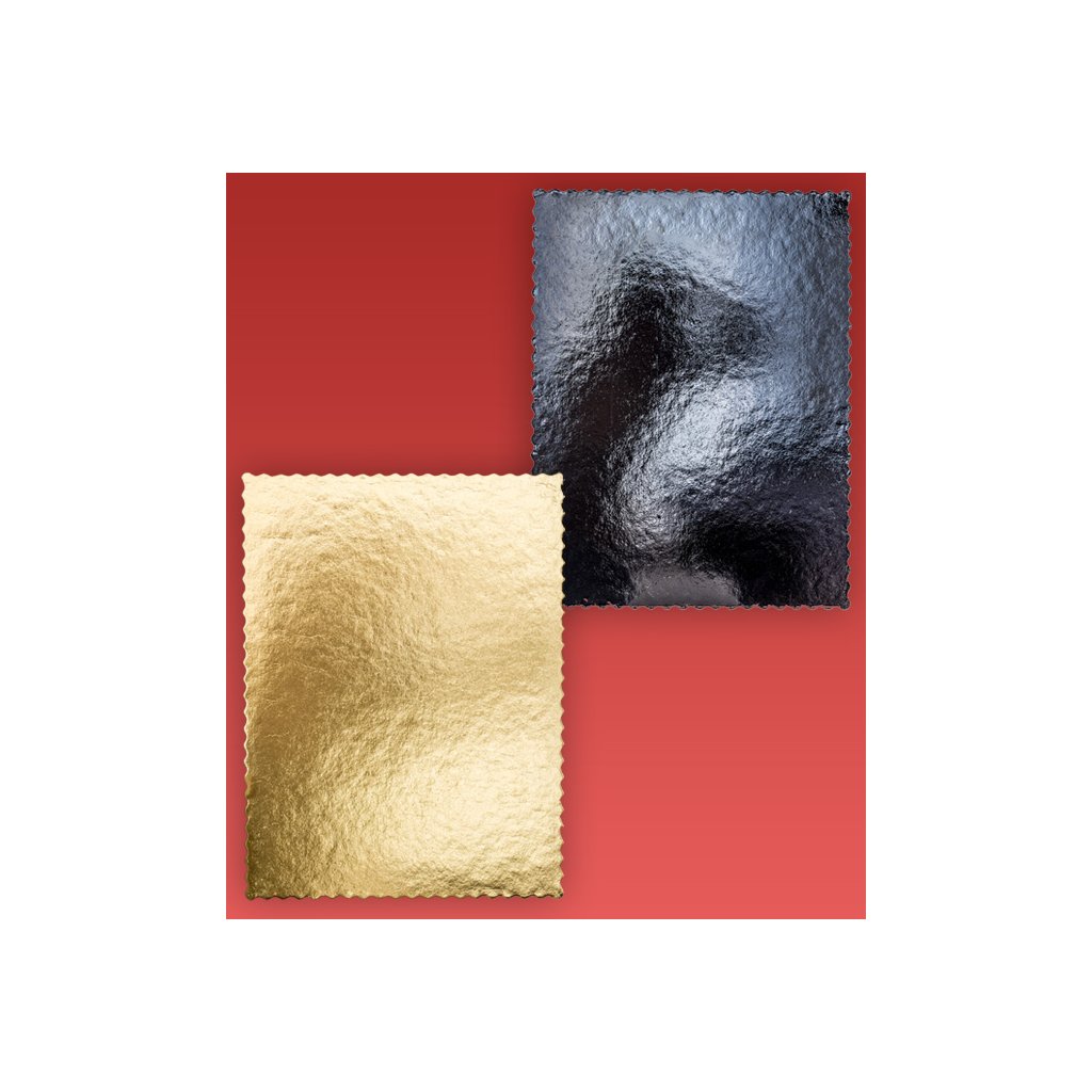 Papírová dortová podložka s vroubkovaným okrajem, obdélníková, velmi pevná. Potažená oboustranně zlatou/černou folií odolnou proti vlhku. Ideální jako nosič dortů.