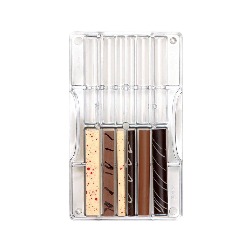 Polykarbonátová forma na čokoládu ve tvaru čokoládových tyčinek.| Kategorie: | Formy na čokoládu |