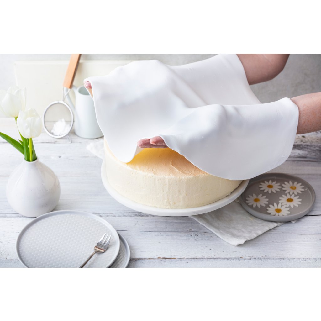 Po aplikaci hmota zcela nevysychá a zůstává svěží, vláčná a nepraská. Hmota je natolik pružná, že je ideální k celoplošnému potahování dortů. Hmotu vyválejte na sílu 0,3 až 0,5 centimetrů. K vyvalování doporučuje použít válečky s distančními kroužky. Na běžný dort o průměru 25 centimetrů budete potřebovat cca 500 gramů potahovací hmoty.