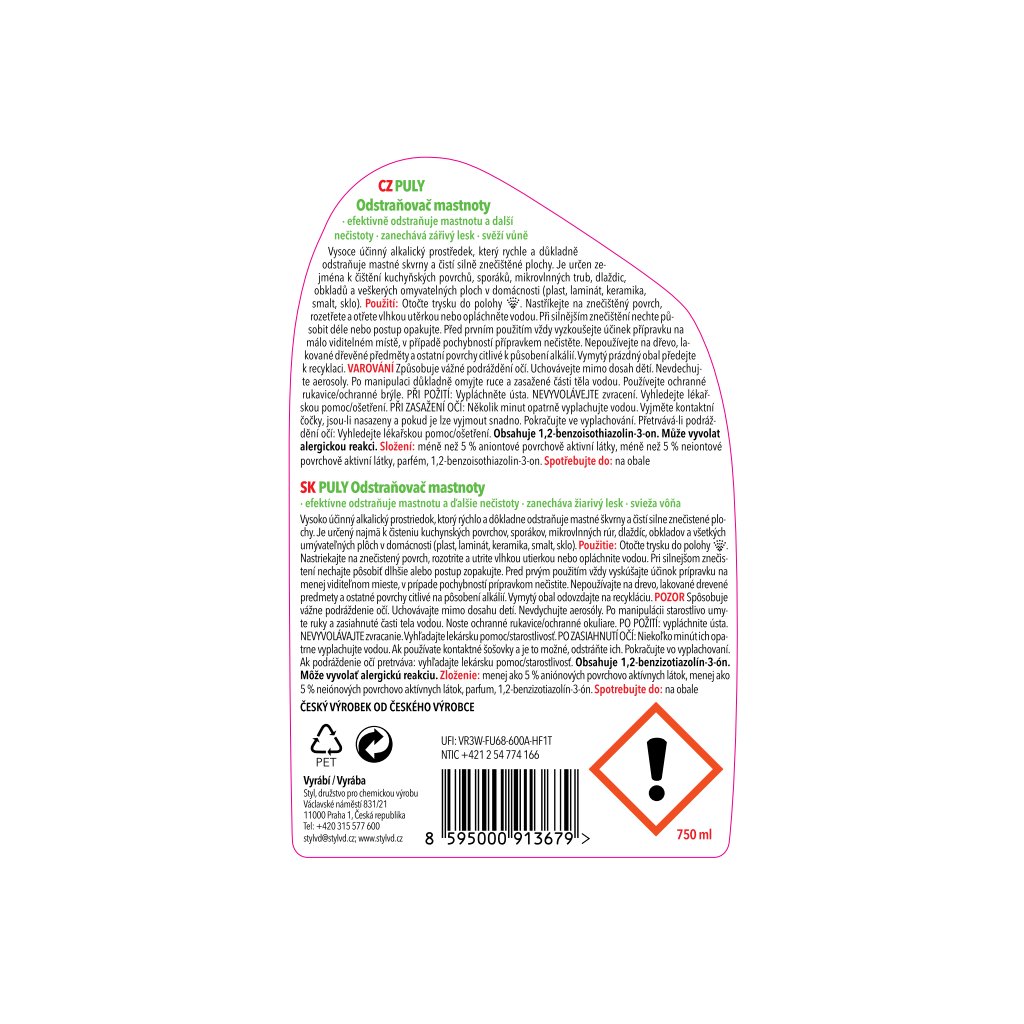 Důležité upozornění: | Dle zákona č. 258/2000 Sb. je minimální věk kupujícího pro uzavření kupní smlouvy na zboží klasifikované jako žíravé 18 let. Vloží-li kupující do košíku takové zboží, prohlašuje tím, že tuto podmínku věku splňuje. |