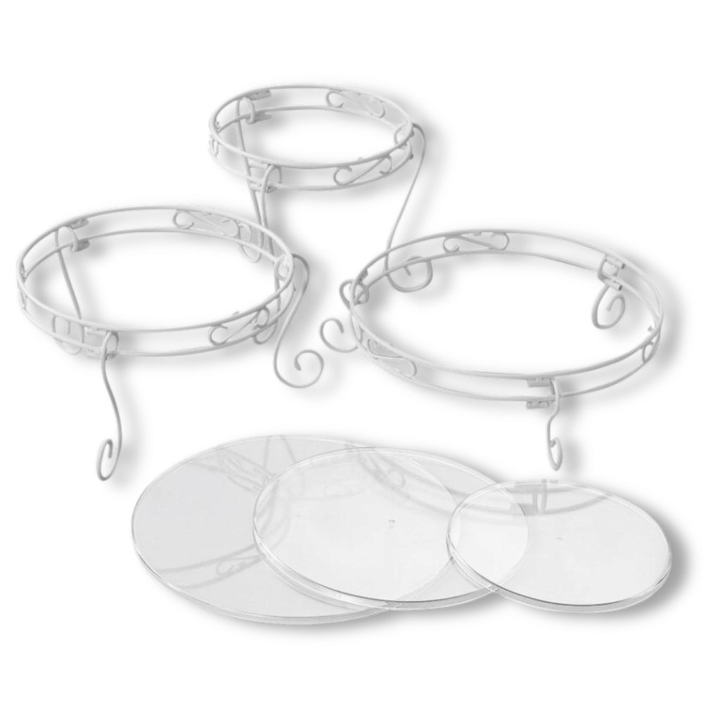 Sada zahrnuje: 3 potažené kovové podpůrné prsteny a 3 průhledné plastové desky i potahované kovové rolovací nohy. Stojan na dort je plně omyvatelný.