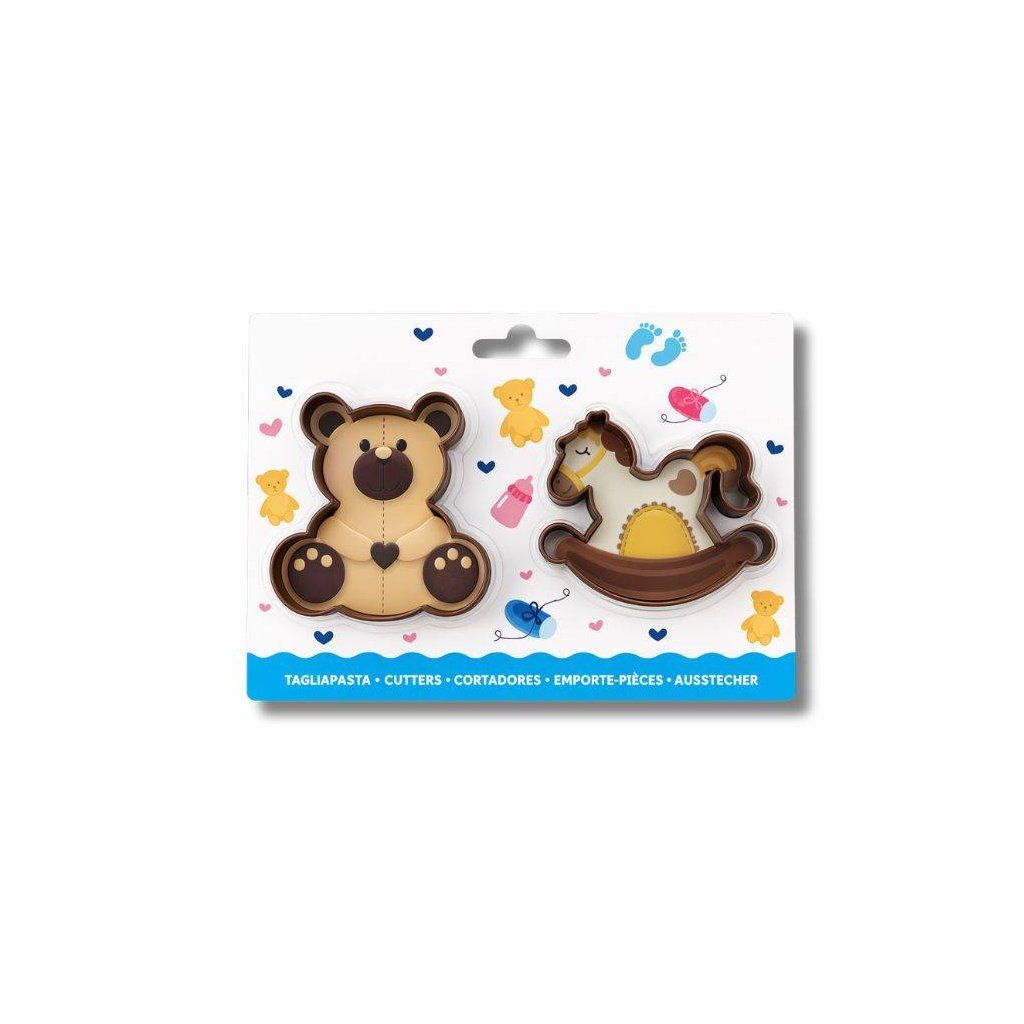 Sada vykrajovátek ve tvaru medvídka a houpacího koníka potěší každého, kdo rád peče a zdobí sladké dobroty s dětským motivem. Vykrajovátka umožňují snadno vytvořit detailní tvary, které vyniknou jak na sušenkách a perníčcích, tak i při práci s fondánem, marcipánem nebo modelovací hmotou.