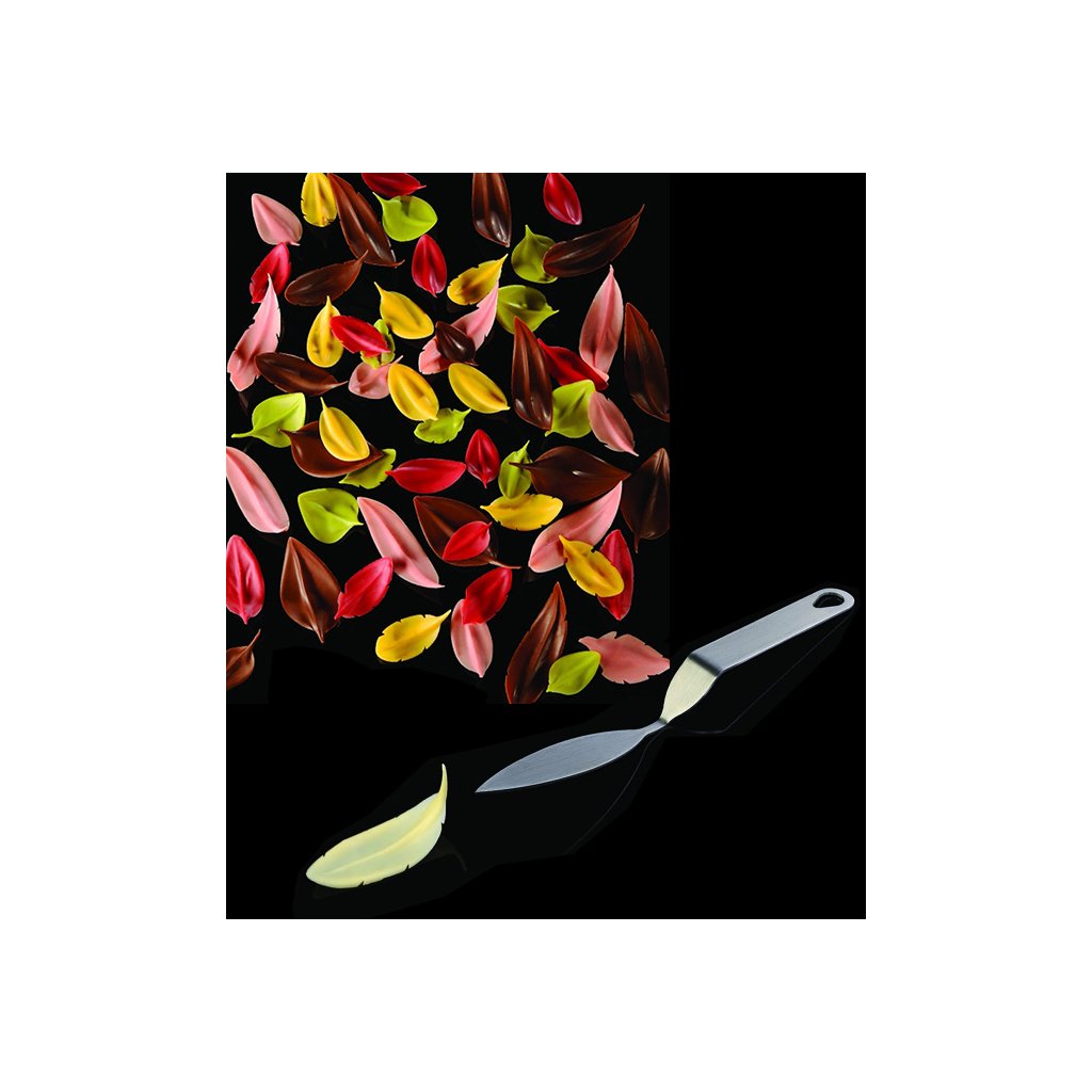 Nerezový nástroj na výrobu čokoládových dekorací ve tvaru peříčka velikosti S. Tyto nástroje jsou vyráběné ve spolupráci s cukrářskými mistry Stefano Laghi a Filippo Re, kteří jsou uznávanými autoritami v oboru.