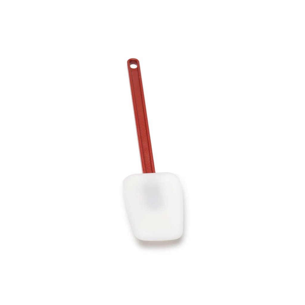 Silikonová stěrka ve tvaru lžíce s rukojetí a otvorem na zavěšení.